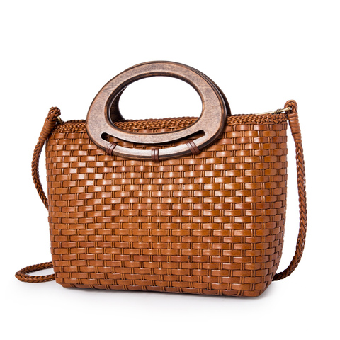 Bolso Vintage para Dama de Cuero Genuino Tejido a Mano con Asas de Madera