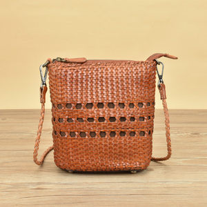 กระเป๋าทรงถังถักหนังแท้สำหรับผู้หญิงกระเป๋าหนังแท้สำหรับงานแฮนด์เมดแนววินเทจ